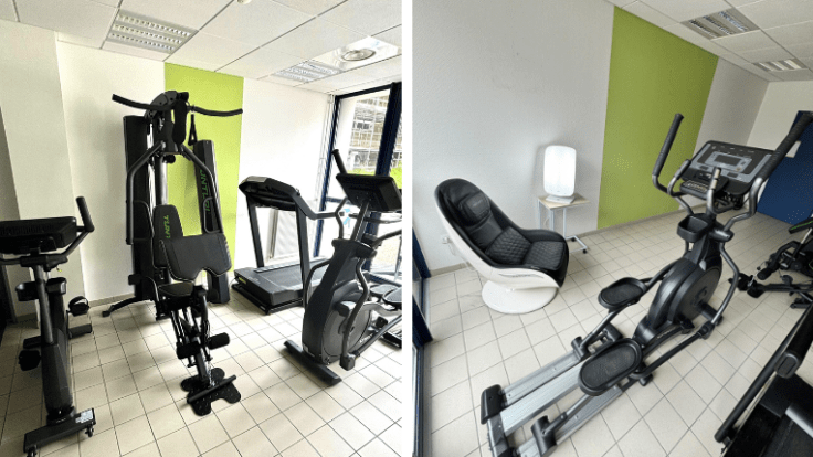 De nouveaux équipements viennent désormais compléter cette salle : un siège massant, une lampe de luminothérapie, une station de musculation, un vélo, un vélo elliptique, un tapis de course, de nombreux altères ainsi que d’autres accessoires de fitness.