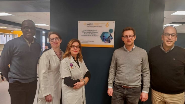 Pose de la signalétique de la Cellule de Recherche Clinique de la Polyclinique du Parc (Saint-Saulve), en présence de Sébastien OLIVEIRA, Directeur SMR des Hôpitaux Privés du Hainaut, du Dr Arnaud MULLIEZ, Chirurgien orthopédiste et traumatologue, de Virginie TAISNE et Anne GOSSET, Pharmaciennes et de Faycal EL JARROUDI, Chef de projet/ARC Coordonnateur de recherche clinique sur le Territoire des Hauts de France.