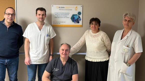 Pose de la plaque/Signalétique de la cellule de recherche du Pôle Imagerie Sambre Avesnois, du groupe Elsan, en présence de la Directrice du Pôle, Me RUGGIERO Sylvana, du Dr MIROULT Laurent, Radiologue , de Florian SCHEPENS, Sandrine LAMBRE Manipulateurs et de Faycal EL JARROUDI, chef de projet/ARC coordonnateur de la CRC des HDF.