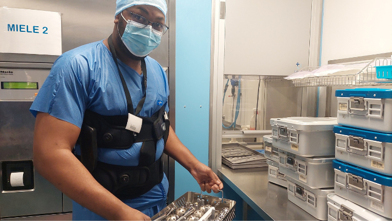 Scalpels, marteaux, ciseaux… Hemerick conditionne les instruments destinés au bloc opératoire. Cet agent de stérilisation à la Clinique Saint-Louis, à Poissy (Yvelines), est chargé du tri, du lavage et de la constitution des kits utilisés en chirurgie. Un métier physique, avec des conditions de travail difficiles, qui générait beaucoup de turnover dans le service. Mais ça, c’était avant l’arrivée des exosquelettes. « Depuis un an, l’équipe est stable, elle n’a pas changé, et nous n’avons plus eu d’arrêts maladie liés au travail », se réjouit Laura Bestman, directrice projets dans l’établissement.