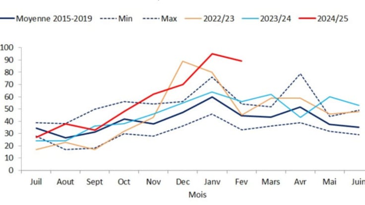 Légende de la photo : Nombre de cas d’infections invasives à méningocoque (IIM) par mois et par saison (janvier et février 2025 : données non consolidées, cas déclarés au 7 mars 2025). Source graphique : Santé publique France.