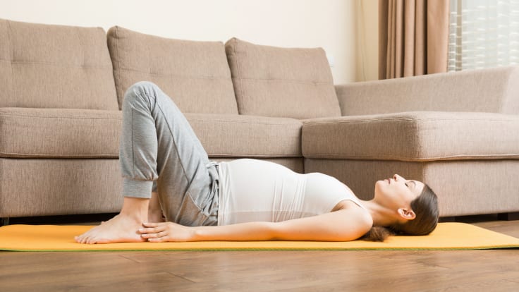 Allongée sur le dos, les genoux fléchis, les pieds posés bien à plat au sol et écartés de la largeur du bassin, inspirez par le nez puis, sur l'expiration (par la bouche), contractez les muscles du plancher pelvien au maximum comme pour retenir un gaz.