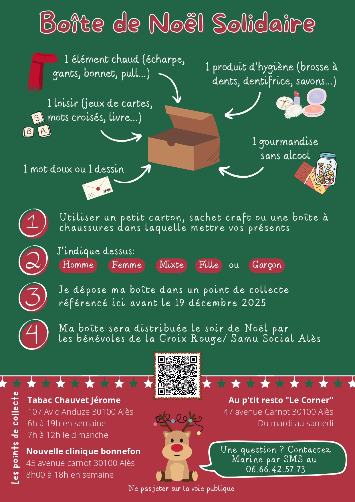 La date limite de dépôt est fixée au 19 décembre 2025. Les boîtes seront ensuite distribuées le soir de Noël par les bénévoles de la Croix Rouge/Samu Social Alès.