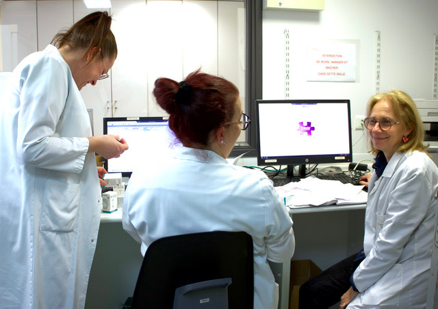 Derrière les portes de l’URC, quatre préparatrices en pharmacie - Nadège, Émilie, Emmanuelle et Claire - s’affairent avec rigueur et dévouement, sous la supervision d'Agnès, en sa qualité de pharmacien. Cette petite équipe, solidaire et passionnée, joue un rôle crucial dans la préparation des traitements de chimiothérapie et d’immunothérapie. Par ailleurs, on reçoit parfois des colis de médicaments dédiés à la recherche clinique, ajoute Agnès, ce qui constitue une autre activité du service.