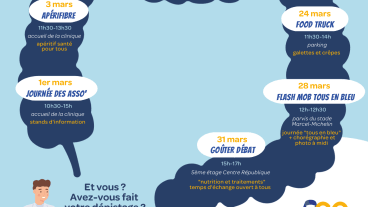 La venue des associations partenaires (l’Oasis des Dômes, la Ligue contre le cancer et Généticancer) ainsi que l’organisation d’autres actions autour de la nutrition viendront compléter les événements phares précédemment cités. En mars, les notes de bleu seront présentes dans tout l’établissement pour rappeler la forte mobilisation.