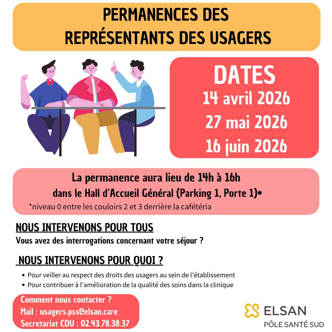 Les 14 avril, 27 mai et 16 juin 2026 se tiendront des permanences des Représentants des Usagers, de 14h à 16h au Pôle Santé Sud.