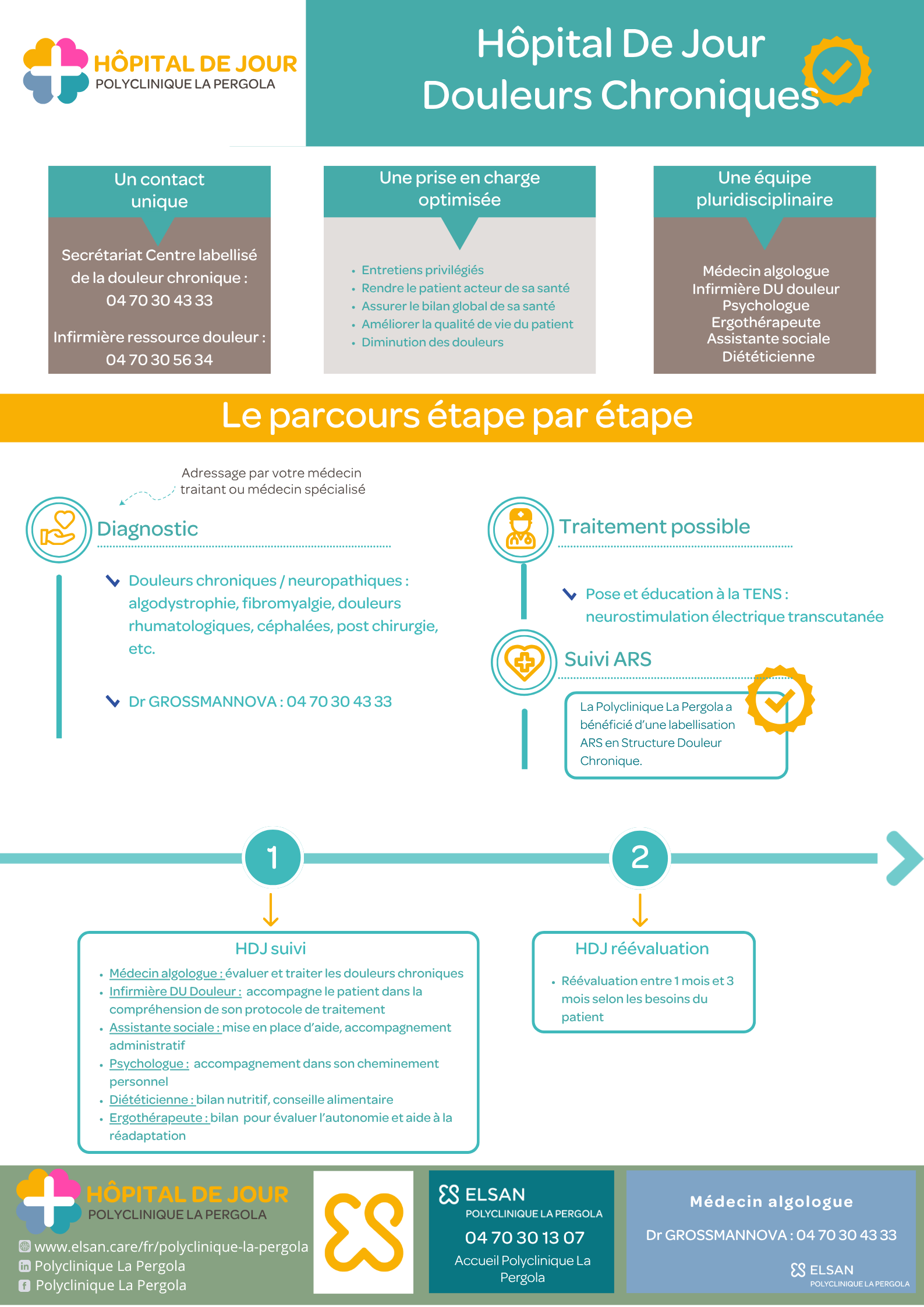 Pour tous renseignements, vous pouvez joindre le secrétariat du Dr Grossmannova, médecin algologue, au 04 70 30 43 33.