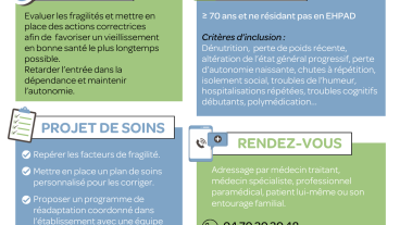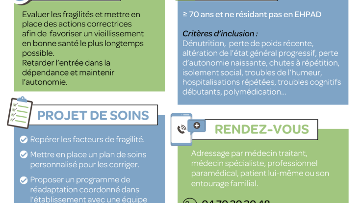 - Evaluer les fragilités et mettre en place des actions correctrices afin de favoriser un vieillissement en bonne santé le plus longtemps possible.
