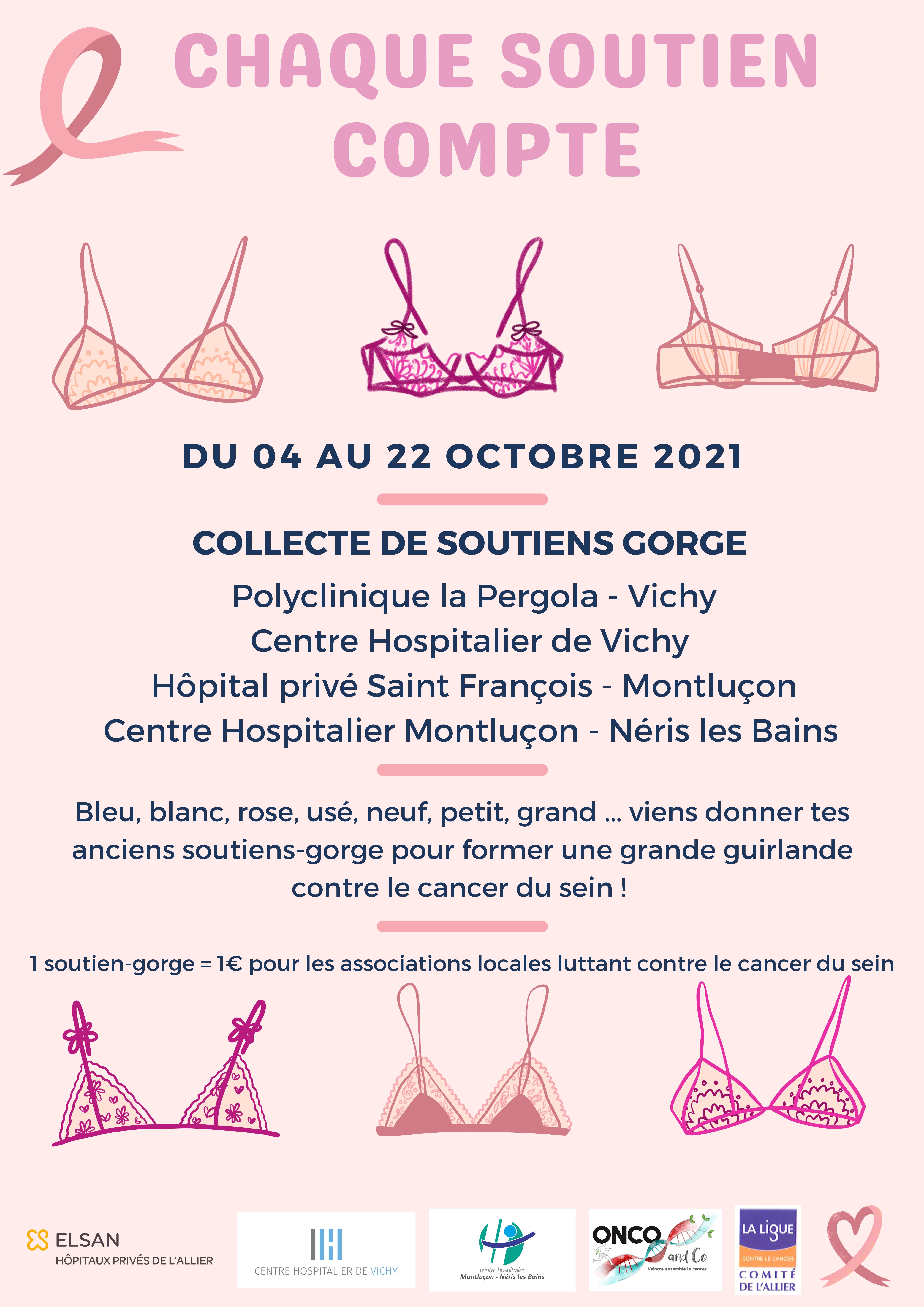 Du 4 au 22 Octobre 2021, une collecte de soutiens gorge est organisée dans les établissements de santé de l'Allier afin de pouvoir former une grande guirlande contre le cancer du sein.
