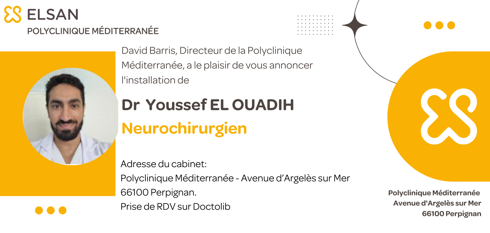 Nous avons le plaisir d’accueillir au sein de notre établissement depuis le mois de juin, le Dr Youssef EL OUADIH, spécialiste en Neurochirurgie.