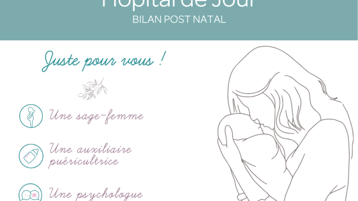 Cet Hôpital de jour accueille les mamans entre 2 et 3 semaines après l'accouchement pour bénéficier d'un suivi médical complet en une demi-journée. Plusieurs acteurs de soins interviendront auprès des mamans pour leur apporter un suivi postnatal plus approfondi après leur accouchement dans un environnement cocooning.