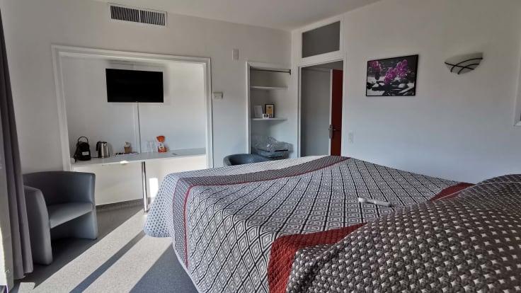 La chambre CALM c'est: un espace privatif calme et spacieux, un lit double médicalisé, un coin courtoisie, un petit déjeuner gourmand pour le couple (tous les jours), du linge de bain et bien d'autres choses encore.
