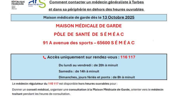 À partir du 13 octobre 2025, la Maison Médicale de Garde (MMG) de Tarbes déménage au Pôle de Santé de Séméac 91 A avenue des Sports – 65600 SÉMÉAC