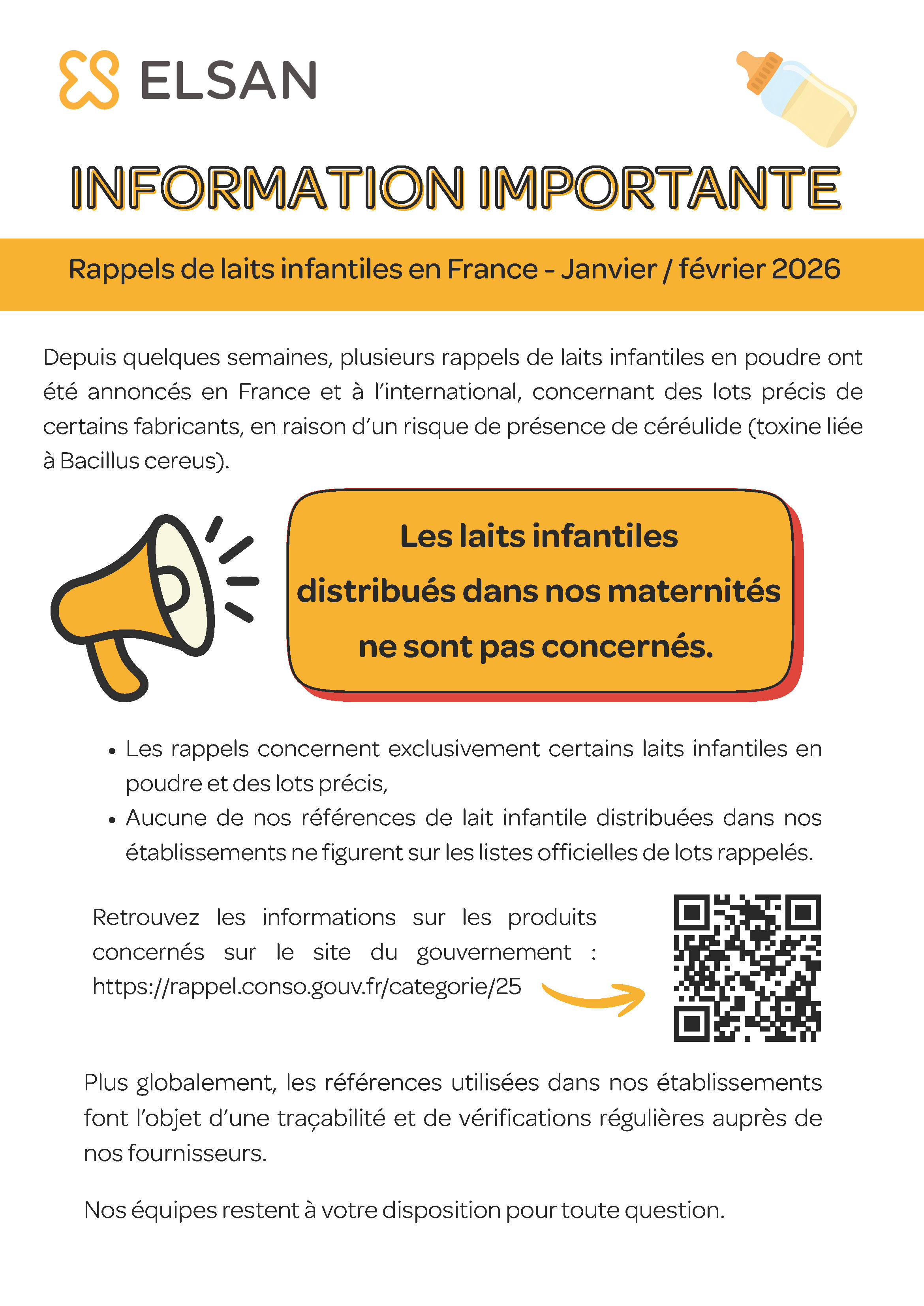 Les laits infantiles distribués au sein de notre maternité ne sont en aucun cas concernés. Les références utilisées ont été vérifiées auprès de nos fournisseurs et ne figurent sur aucune alerte officielle.