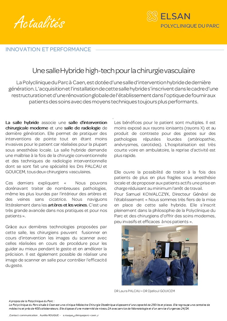 Pour Samuel KOWALCZYK, Directeur Général de l’établissement « Nous sommes très fiers de la mise en place de cette salle hybride. Elle s’inscrit pleinement dans la philosophie de la Polyclinique du Parc et des chirurgiens d'offrir des soins modernes, peu invasifs et efficaces à nos patients ».