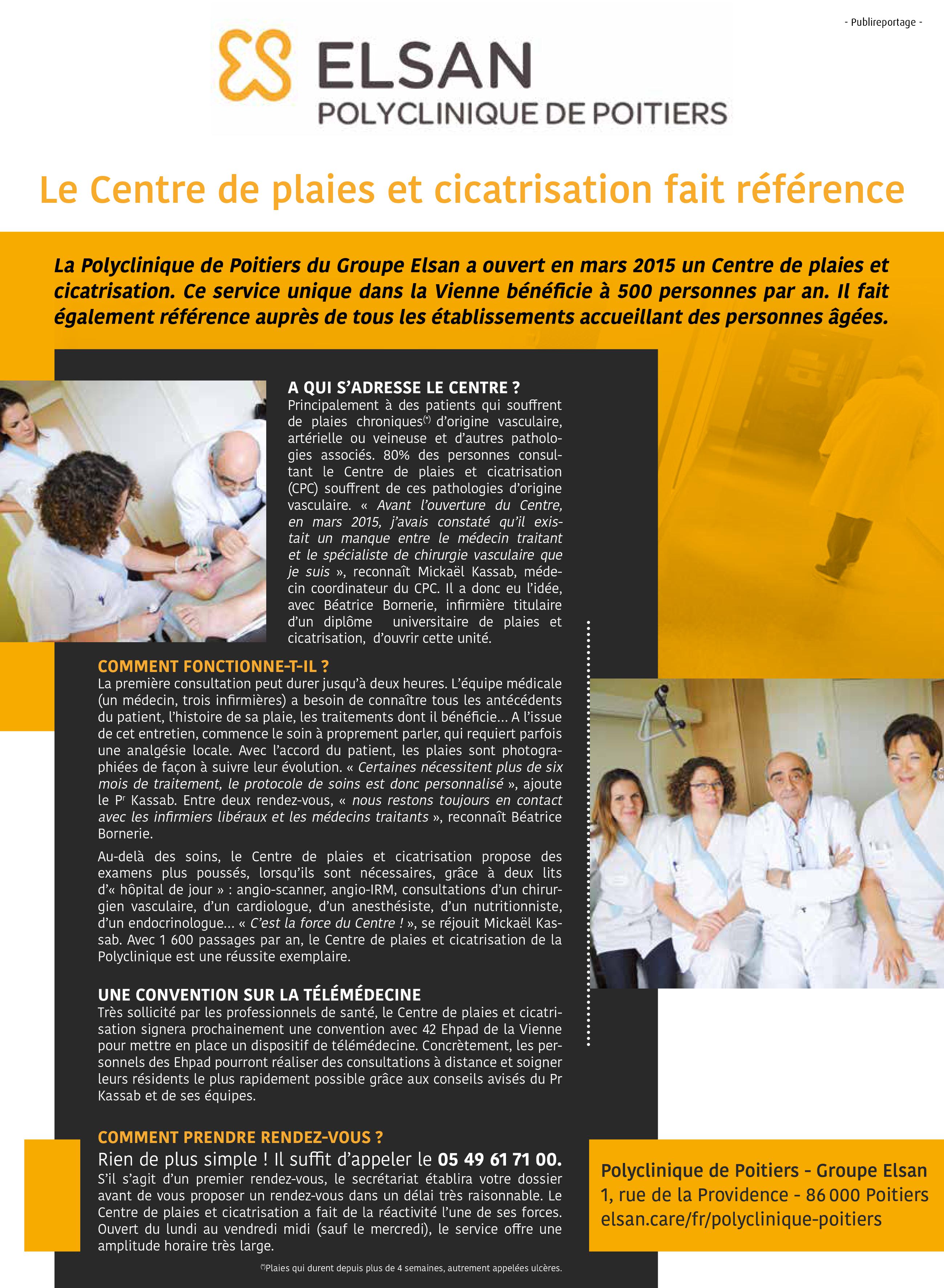 La Polyclinique de Poitiers dispose non seulement des ressources multidisciplinaires humaines et techniques à travers un plateau technique adapté et performant mais aussi des structures complémentaires nécessaires tel que la clinique Saint Charles (SSR) et l’HAD Privée ce qui permet d’assurer une continuité dans la prise en charge et de tracer ainsi un véritable parcours de soins pour les patients atteints de plaies chroniques.