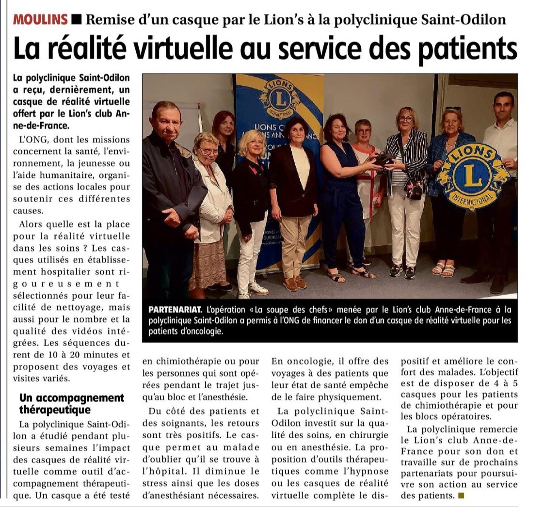 Le Lions Club a organisé, fin 2023, une vente de « Soupe des Chefs » à Moulins et dans les locaux de la Polyclinique. Une partie des bénéfices récoltés a été directement reversée à la Polyclinique pour l’achat du casque VR.