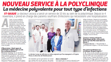 La médecine polyvalente pour tous types d’infections : le docteur Lecocq a lancé un service de 10 lits au sein de la polyclinique. Depuis le 4 novembre, il prend en charge des patients souffrant d’infections qui nécessitent une hospitalisation.