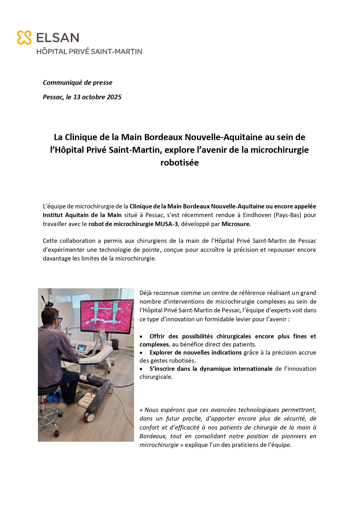 Cette collaboration a permis aux chirurgiens de la main de l’Hôpital Privé Saint-Martin de Pessac d’expérimenter une technologie de pointe, conçue pour accroître la précision et repousser encore davantage les limites de la microchirurgie.