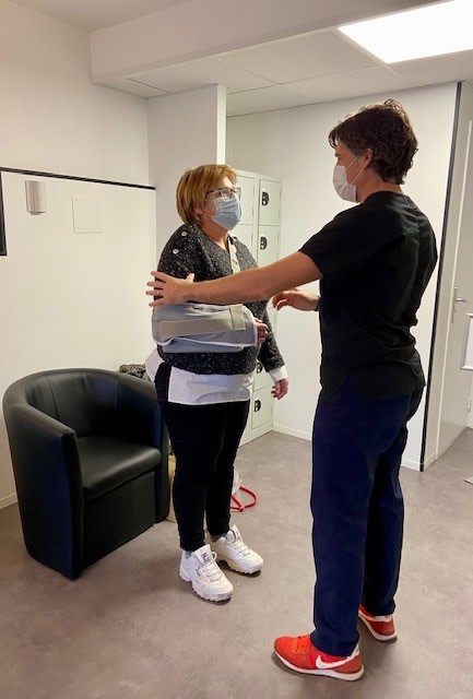 Une fois à domicile, les patients effectuent le glaçage de l’épaule opérée avec une attelle de cryothérapie dédiée et débutent leur auto rééducation.