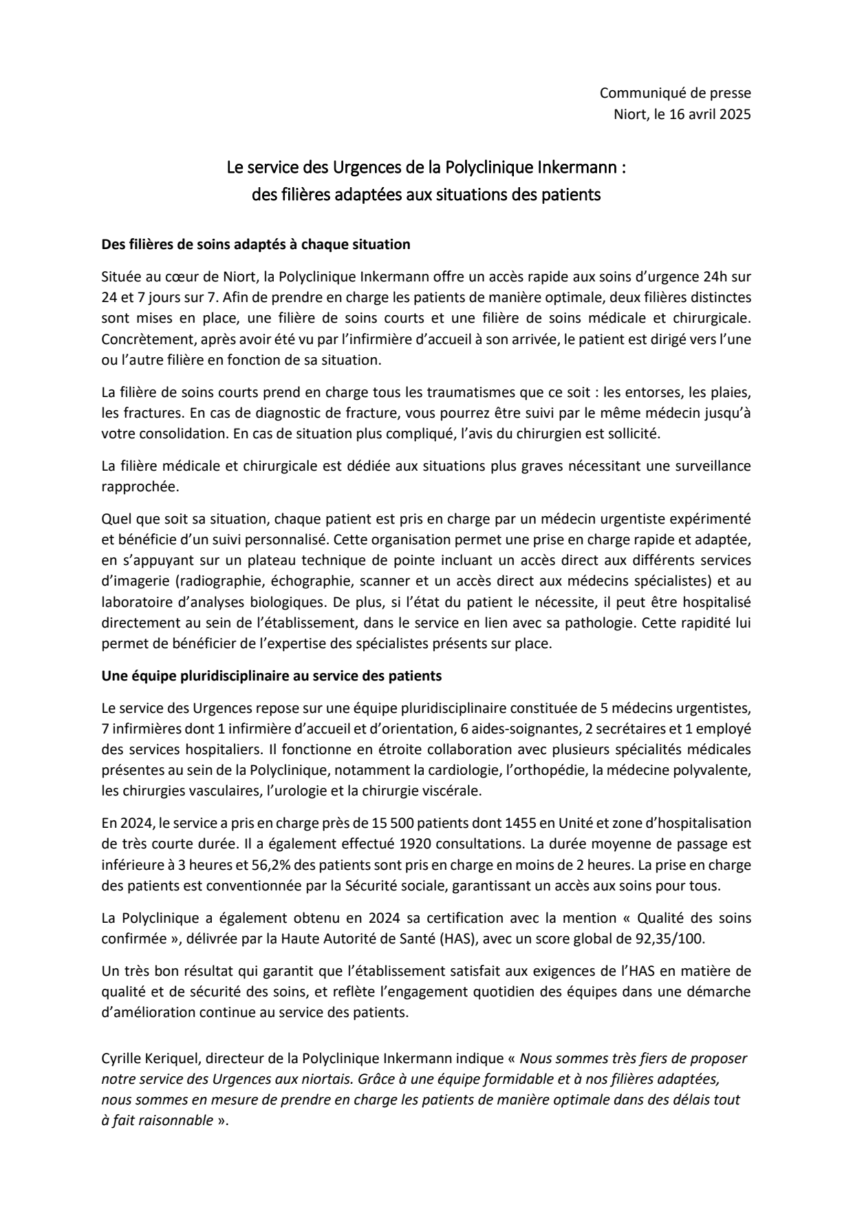 Cyrille Keriquel, directeur de la Polyclinique Inkermann indique « Nous sommes très fiers de proposer notre service des Urgences aux niortais. Grâce à une équipe formidable et à nos filières adaptées, nous sommes en mesure de prendre en charge les patients de manière optimale dans des délais tout à fait raisonnable ».